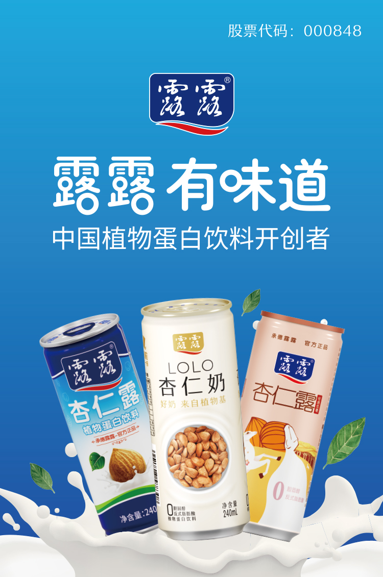 承德露露股份公司(股票代码:000848)是中国植物蛋白饮料的开创者与先行者。多年来,露露对品质的坚守得到了业界和消费者的一致认同,以匠人精神始终专注于研发原生态高端植物蛋白饮品。此外,露露还主导制定了《植物蛋白饮料杏仁露》国家标准,并入选中国最具价值品牌500强。